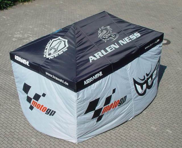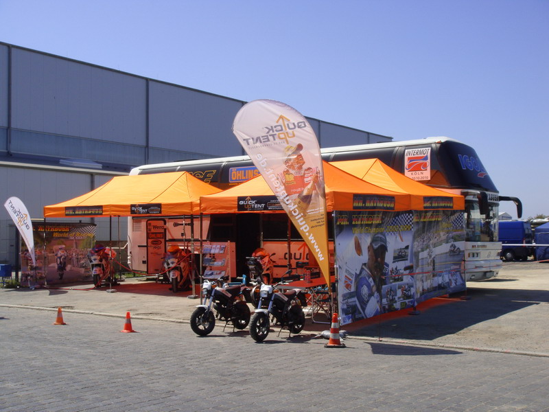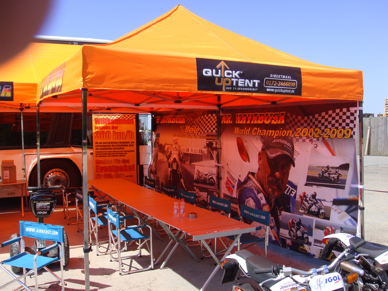 Faltzelte gehören zum Motorsport wie die Butter zum Brot. Sie bestimmen neben den Renntransportern das Bild eines jeden Fahrerlagers. Als Vordach für die Motorhomes der Rennteams, als mobile Werkstatt, als Cateringbereich für Team[-]gäste und Sponsoren, als Dach über den Rennmaschinen, an denen auch bei Wind und Wetter geschraubt wird.