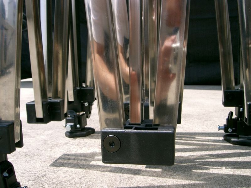 Zwar bietet sich auf den ersten Blick als Material für die Falt[-]gestänge Aluminium an – es ist leicht, korrosions[-]beständig und sieht gut aus. Jedoch ist Alu[-]minium ein weiches Material, das somit auch schon mal beim Aus[-]ein[-]ander[-]ziehen hakt; auch seine schlechte Schweißbarkeit und vor allem die problem[-]atische Dauer[-]bruch[-]festig[-]keit wirft es weit zurück gegenüber einem besseren und edleren Materialkandidaten: V2A-Edelstahl. Dieser Legierungstyp nichtrostenden Stahls (Fachbezeichnung X5CrNi18-10 / Werkstoffnummer 1.4301), ist wegen seiner Korrosions[-]be[-]ständig[-]keit praktisch uneingeschränkt strapazierfähig.V2A-Edelstahl wird in der Medizintechnik zur Herstellung chirurgischer Instrumente verwendet und hält so höchsten Hygiene-Anforderungen stand, was beispielsweise im Catering-Einsatz essenziell wichtig ist.