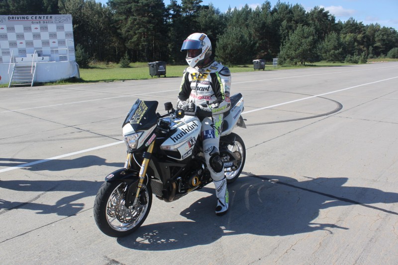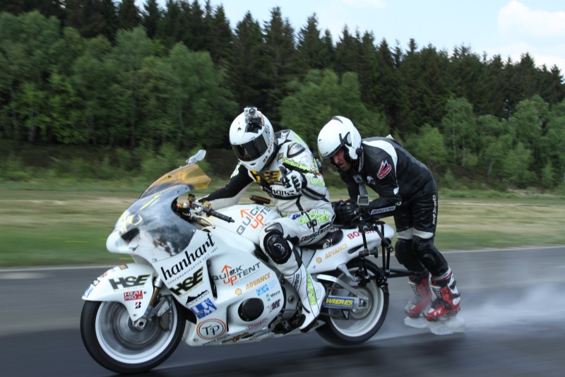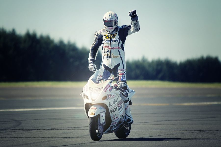 Doch der Reihe nach:Seit Beginn der 1980er Jahre ist er im professionellen Motorrad-Rennsport unterwegs, seine Karriere strotzt von Höhepunkten. Angefangen hatte alles im Motocross – hier holte sich Elmar viermal den Titel Deutscher Meister, und zwar in der Seitenwagenklasse.Seine wirkliche Liebe aber gehörte dem Straßenrennen, wohin er 1982 in einer fulminanten Aktion wechselte. Damals gewann er souverän sein allererstes Rennen; schaffte innerhalb nur einer Saison den Sprung in die internationale Klasse (AI-Lizenz).Superbike, Langstrecken-WM (bester Privatfahrer bei den 24 Stunden von Le Mans), die legendären Asien-GP´s von Macao, Indonesien und Malaysia - Elmar Geulen war überall dabei und das mit Furore. Heute ist er offiziell "Mr. Hayabusa" – den Namen verlieh ihm "SUZUKI INTERNATIONAL EUROPE" angesichts der Tatsache, dass er als Einziger crazy genug war, mit der ei[-]gent[-]lich als Sporttourer konzipierten Suzuki Hayabusa ernsthaft professionellen Rennsport zu betreiben.Und das mit nachhaltigem Erfolg- Deutscher Meister und achtfacher World Champion! www.mr-hayabusa.deFreilich mussten dazu dem etwas pum[-]mel[-]igen "Schlachtross" ein wenig die Sporen gegeben werden. Das besorgt von Anfang an bis heute Tuner-Ass Hennes Löhr von LKM, der federführend mit[-]ver[-]ant[-]wort[-]lich ist für den anhaltenden Erfolg eines genialen Motorrades, das aber nicht wirklich für den Motorsport gedacht ist. www.lkm.de