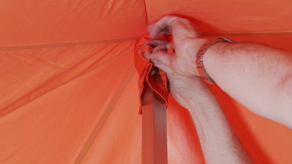 Gehen Sie nun wieder unter das Dach und bringen das Dach auf finale, maximale Spannung. Hierfür einfach die vier/sechs Laschen mit dem Flausch durch die Öffnung der Ver[-]bindungselemente stecken und mit ein wenig Zug an dem Klett befestigen. (wichtiger Hinweis: vor dem Abbau des Zeltes müssen Sie alle diese Laschen lösen)