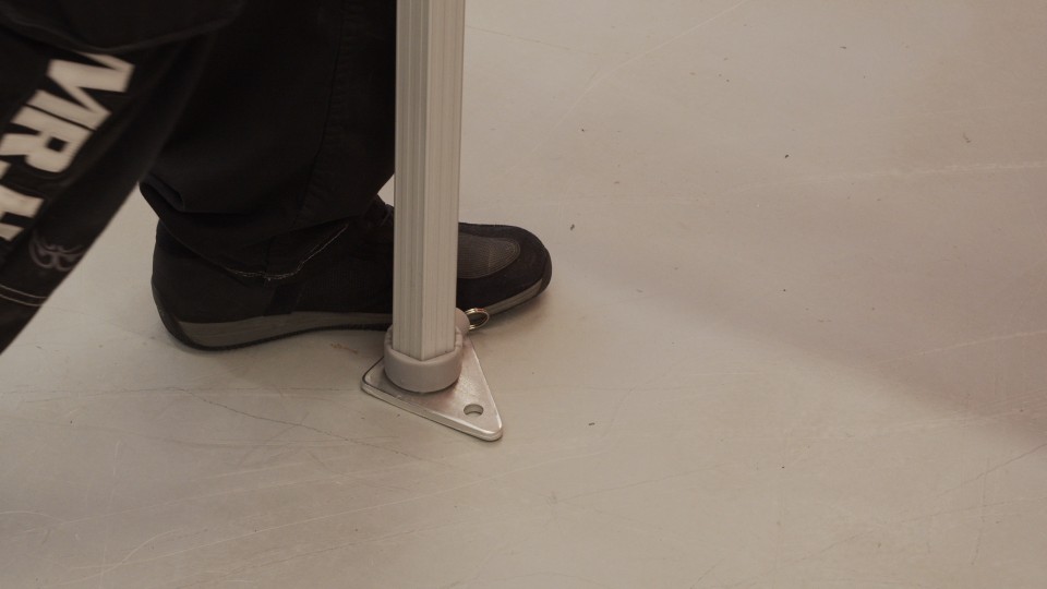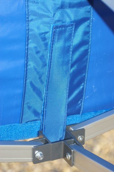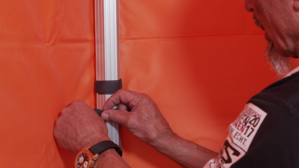 Legen Sie innen die Klett/Flausch[-]bänder der Seiten[-]wände um die Pfosten um diese so zu fixieren. Zum Schluss drücken Sie mit Ihrer Fuß[-]spitze die Eckpfosten von innen gegen die untereinander ver[-]bundenen Seitenwände nach außen.