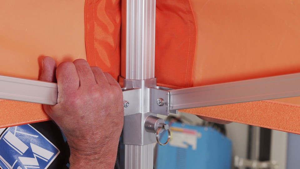 Wenn Sie auch Seitenwände einhängen möchten, müssen Sie jeweils den Bolzen in das oberste Loch einrasten lassen. Nun ist Ihr QUICKUPTENT aufgebaut und es können die Seitenwände montiert werden. Der Abbau geschieht im Prinzip in umgekehrter Reihenfolge.