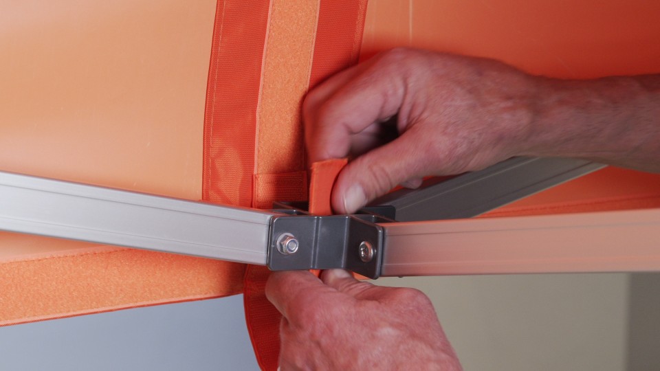 Jetzt das Dach mit zwei Mann über den Rahmen heben und dann den Klett auf den 4 Dachecken (innen im Dach) mit dem Flausch auf dem Rahmen fixieren.