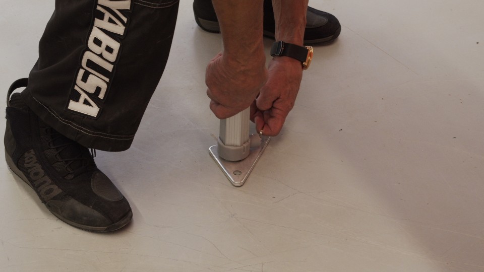 Jetzt wird der Rahmen arretiert indem man die Verschlüsse hoch schiebt. Die Verschlüsse rasten dann oben in den Pfosten auto[-]matisch ein. Der Aluminium-Rahmen ist nun komplett auseinander gezogen und arretiert.