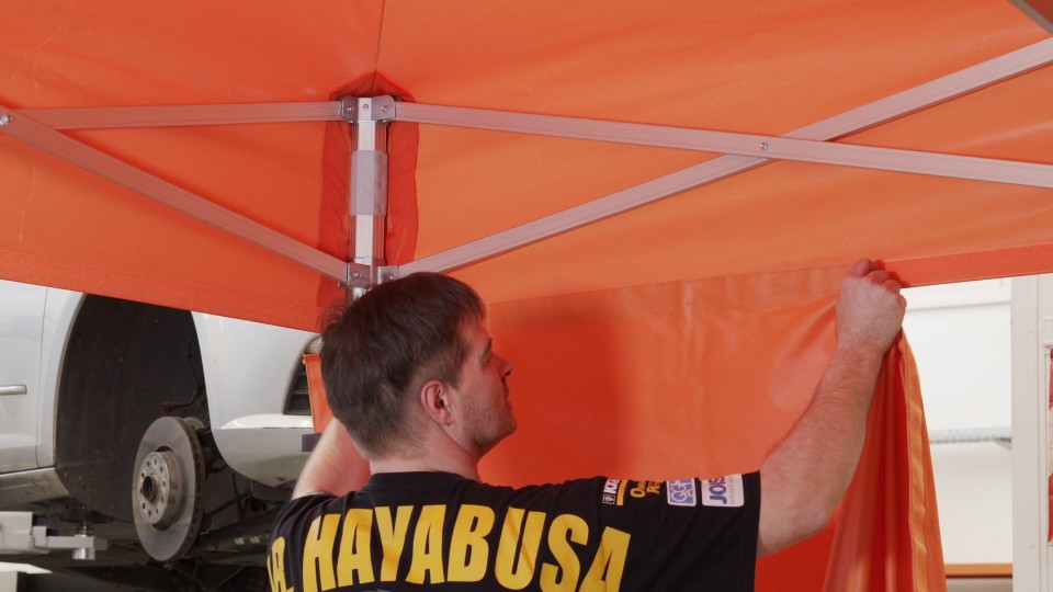 Nun wird der Faltzelt-Rahmen komplett auseinander gezogen. Die Domstreben drücken das Dach in die Höhe und geben dem Dach die richtige Form.
