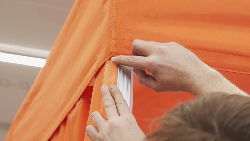 Die Seitenwände werden in der Senk[-]rechten über[-]lappend mit Klett [&] Flausch verbunden. Richten Sie die Seitenwand so aus, dass dieser Klett oder Flausch oben am Volant an dem Eckpfosten übersteht.