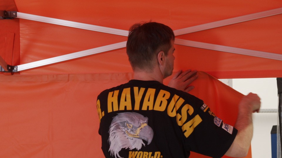 Das Faltzelt steht schnell, sicher und ist dank des 6-eckigen Wabenprofils fast unverwüstlich.