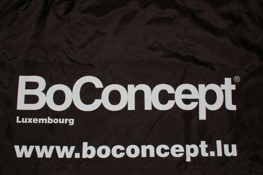 Der Siebdruck ist unser drittes Druckverfahren bei dem die jeweilige Druckfarbe mit einer Gummirakel durch ein feinmaschiges Gewebe hindurch auf den zu bedruckenden Zeltstoff gedruckt wird. An denjenigen Stellen des Gewebes, wo dem Logo oder Schrift entsprechend keine Farbe gedruckt werden soll, werden die Maschenöffnungen des Gewebes durch eine Schablone farbundurchlässig gemacht. Einfachere Grafiken wie beispielsweise Logos und Schriften werden so in beliebiger Größe lacktechnisch direkt auf das Zelt gebracht. Wir benutzen für den Siebdruck eine Zweikomponentenfarbe, die speziell für die Bedruckung von Faltzelten und Sonnenschirmen hergestellt wird.