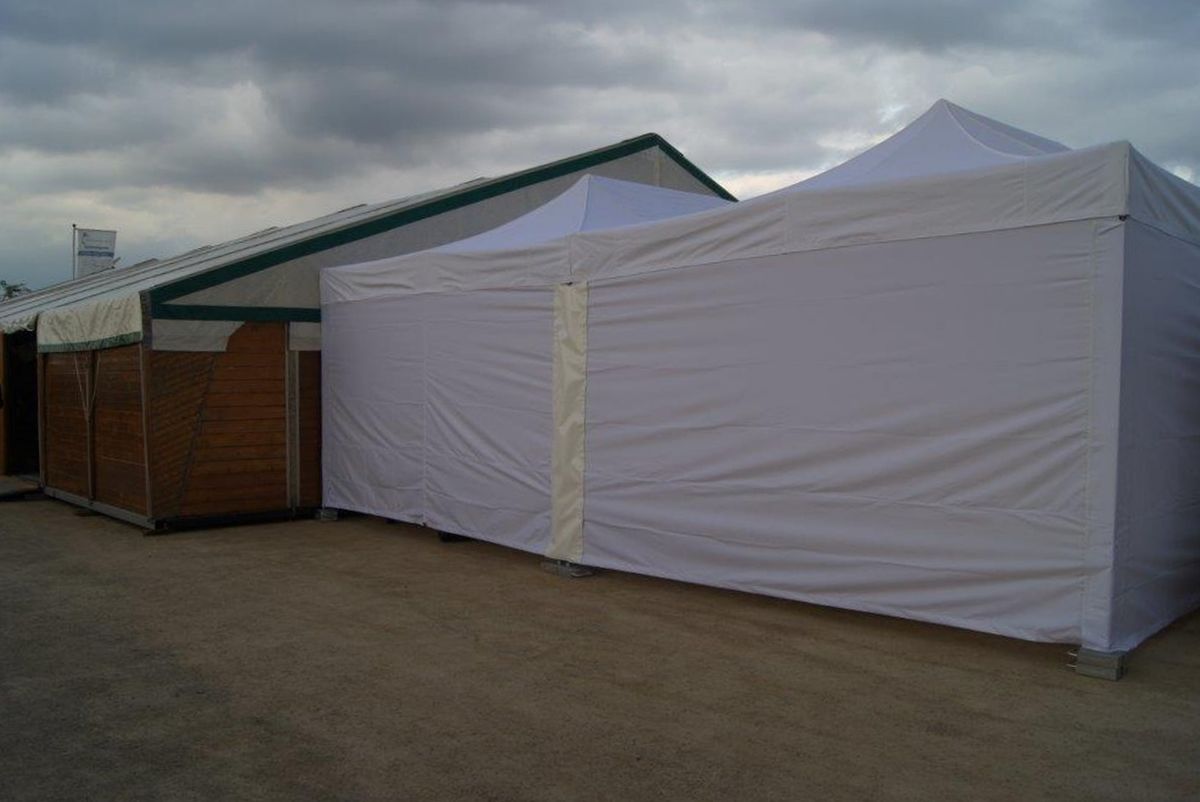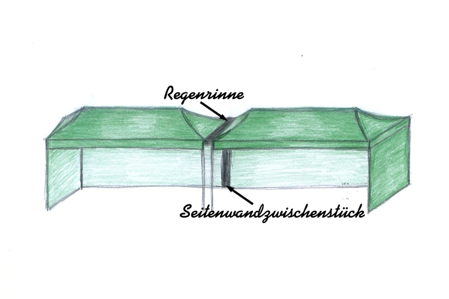 Die Faltzelte werden mittels Zeltverbindungsklemmen, Regenrinnen und Seitenwandzwischenstück miteinander zu einer Einheit verbunden.