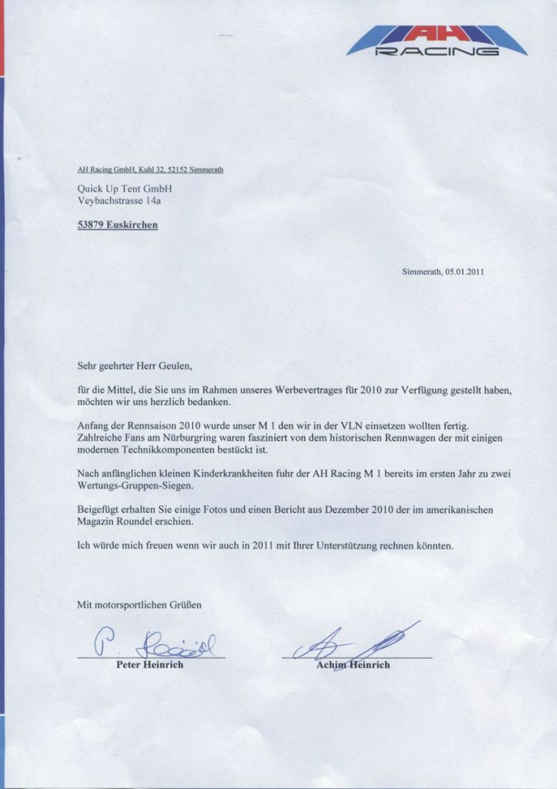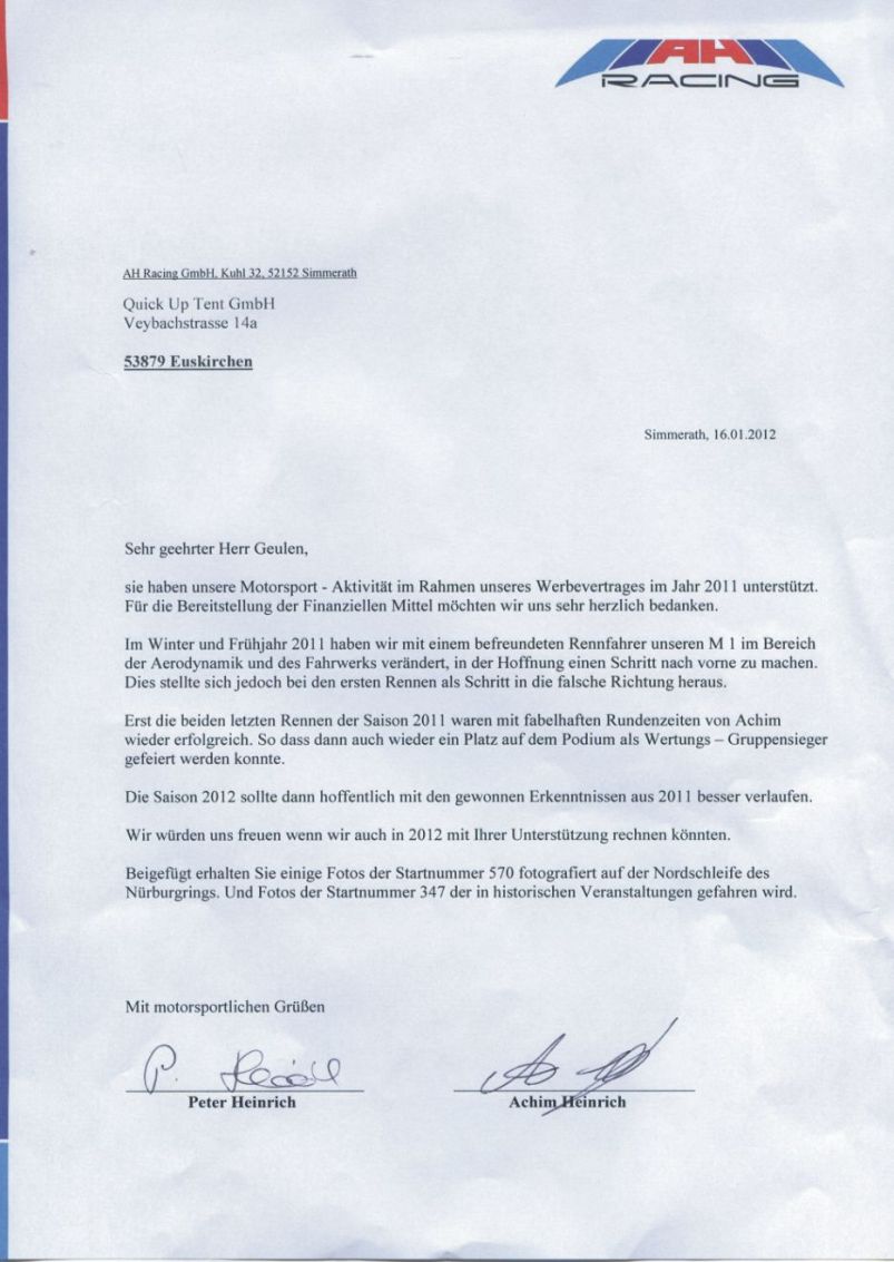 QUICKUPTENT als Sponsor des AH Racing Team in der Rennsaison 2012
